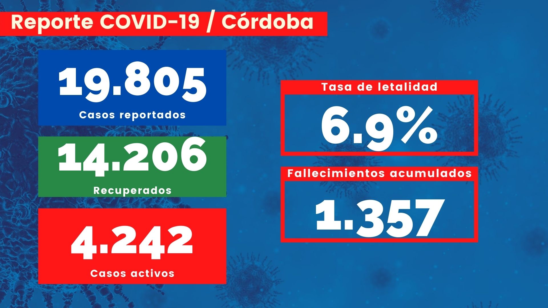 Córdoba tiene a corte del lunes 31 de agosto 19.805 contagios positivos, 14.206 de esos están recuperados lo que representa el 71% de los casos.