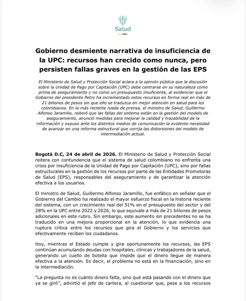 La entidad reiteró que la discusión sobre la Unidad de Pago por Capitación (UPC) debe centrarse en su naturaleza como prima de aseguramiento y no en una supuesta insuficiencia presupuestal. Según el Gobierno Nacional, los recursos destinados al sector han aumentado de manera significativa en los últimos años, sin que esto se refleje en una mejora proporcional en la atención a los usuarios.