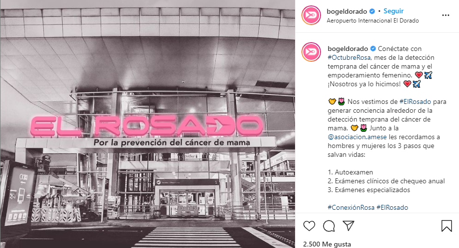 El aeropuerto pasará a llamarse ‘El Rosado’, el color simbólico y que representa dicho padecimiento. La modificación nominal momentánea llegó tras una alianza entre El Dorado y la Asociación AMESE.