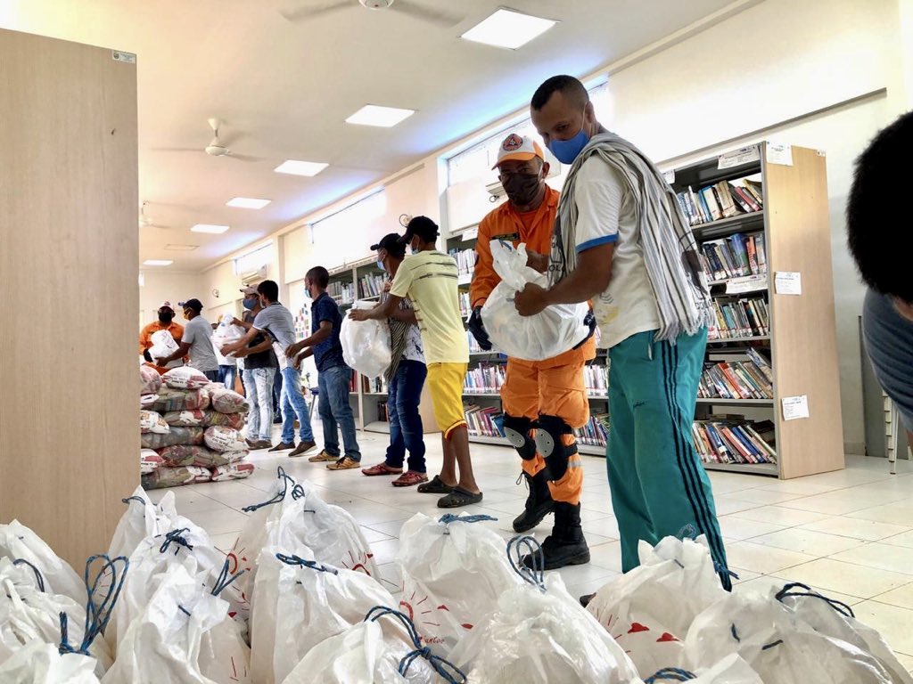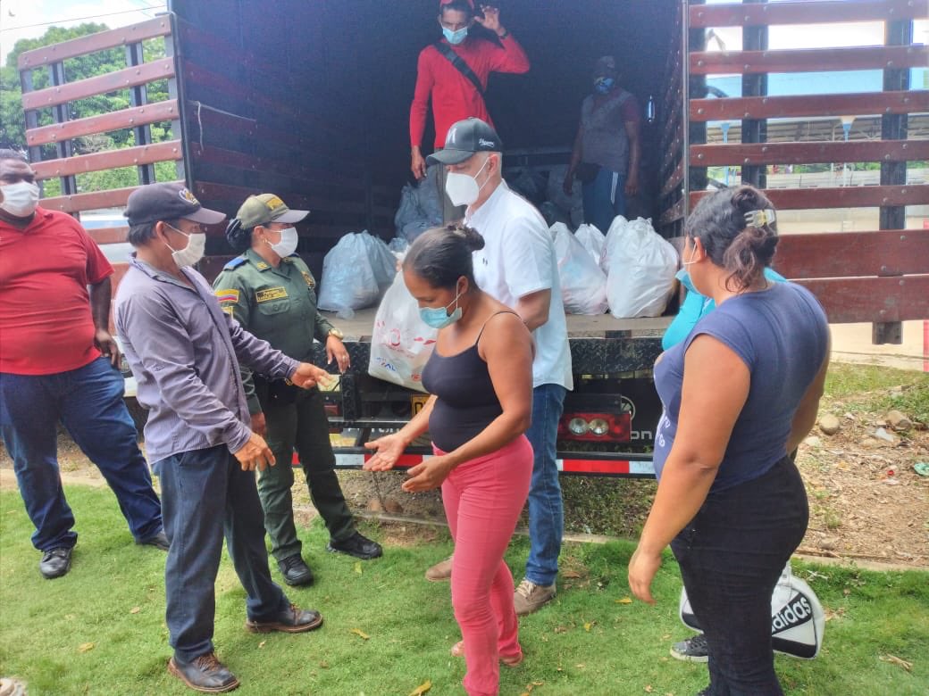 La administración departamental entregó kits de alimentación a estas familias que se asentaron en un polideportivo del municipio de San José Uré.