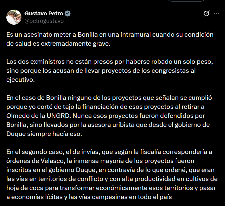 “Es un asesinato meter a Bonilla en una intramural cuando su condición de salud es extremadamente grave”, escribió el mandatario, refiriéndose al episodio de isquemia cerebral temporal que sufrió el exministro de Hacienda hace tres meses y que, según advirtió Bonilla en audiencia, “puede repetir”.