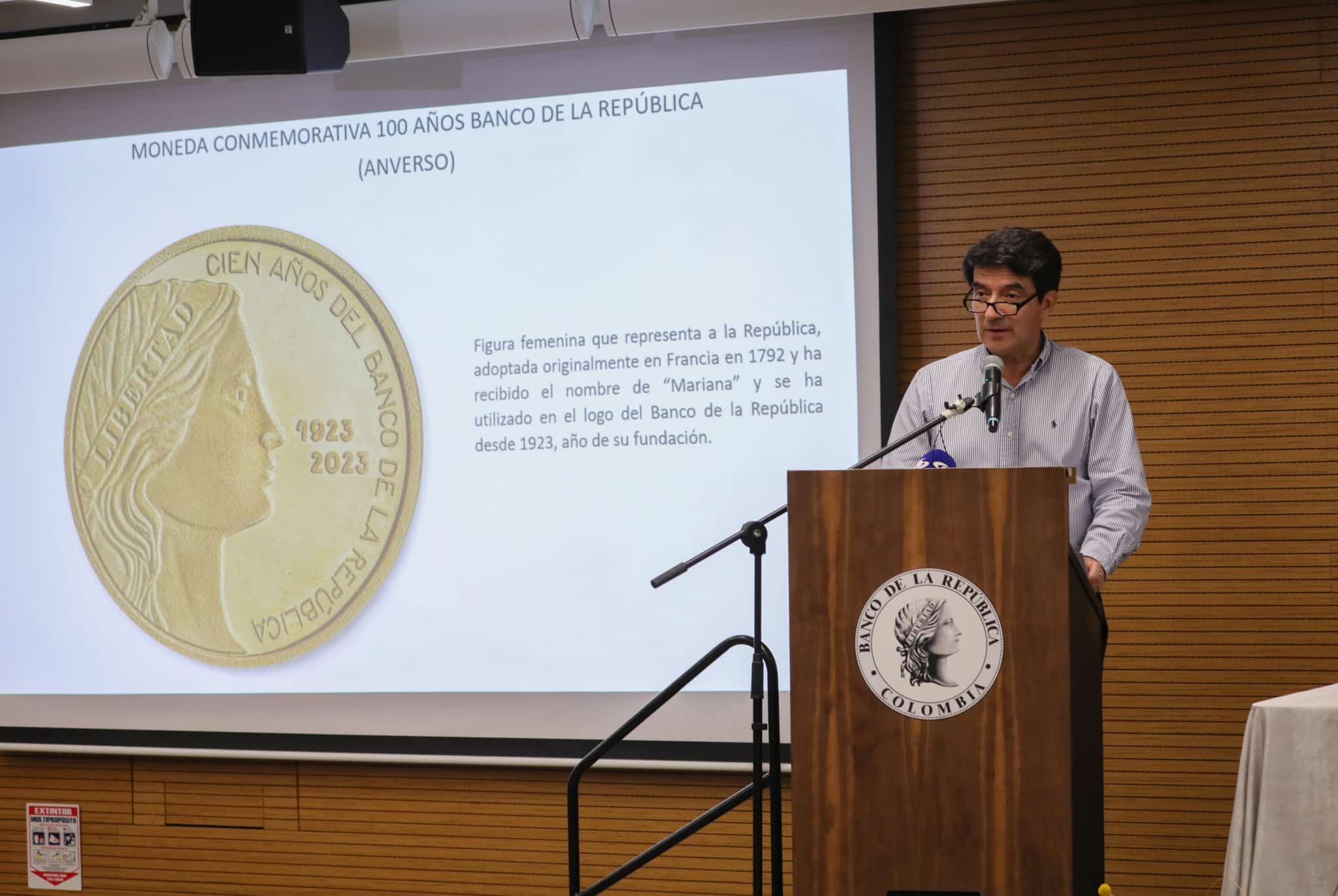 La moneda, acuñada por única vez, presenta en su anverso la icónica figura femenina que representa a la República, utilizada en el logo del Banco desde su fundación en 1923. En el reverso, destaca un mapa de Colombia con la leyenda “100 AÑOS Generando confianza” rodeado de símbolos que representan la estabilidad y gestión, junto con elementos de seguridad como una imagen latente y números en braille.