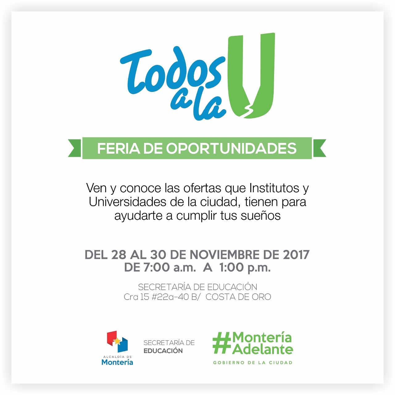 A partir de este martes 28 de noviembre y hasta el jueves 30, desde las 7:00 am hasta la 1:00 pm, en horario continuo, se desarrollará en la sede de la Secretaría de Educación de Montería, la Feria de Oportunidades: “Todos a la U”, mediante la cual se busca acercar la oferta de Institutos de formación para el trabajo y desarrollo humano y de Universidades de la ciudad a los estudiantes y egresados de Instituciones Educativas Oficiales del municipio.