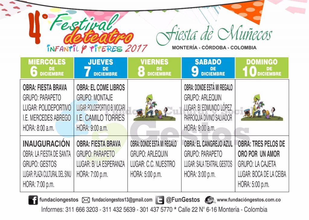 Con una variada programación para disfrutar en familia, llega a Montería la cuarta versión del Festival de Teatro Infantil y Títeres 2017, que lidera la Fundación Gestos y se realizará desde este miércoles 6 hasta el domingo 10 de diciembre.