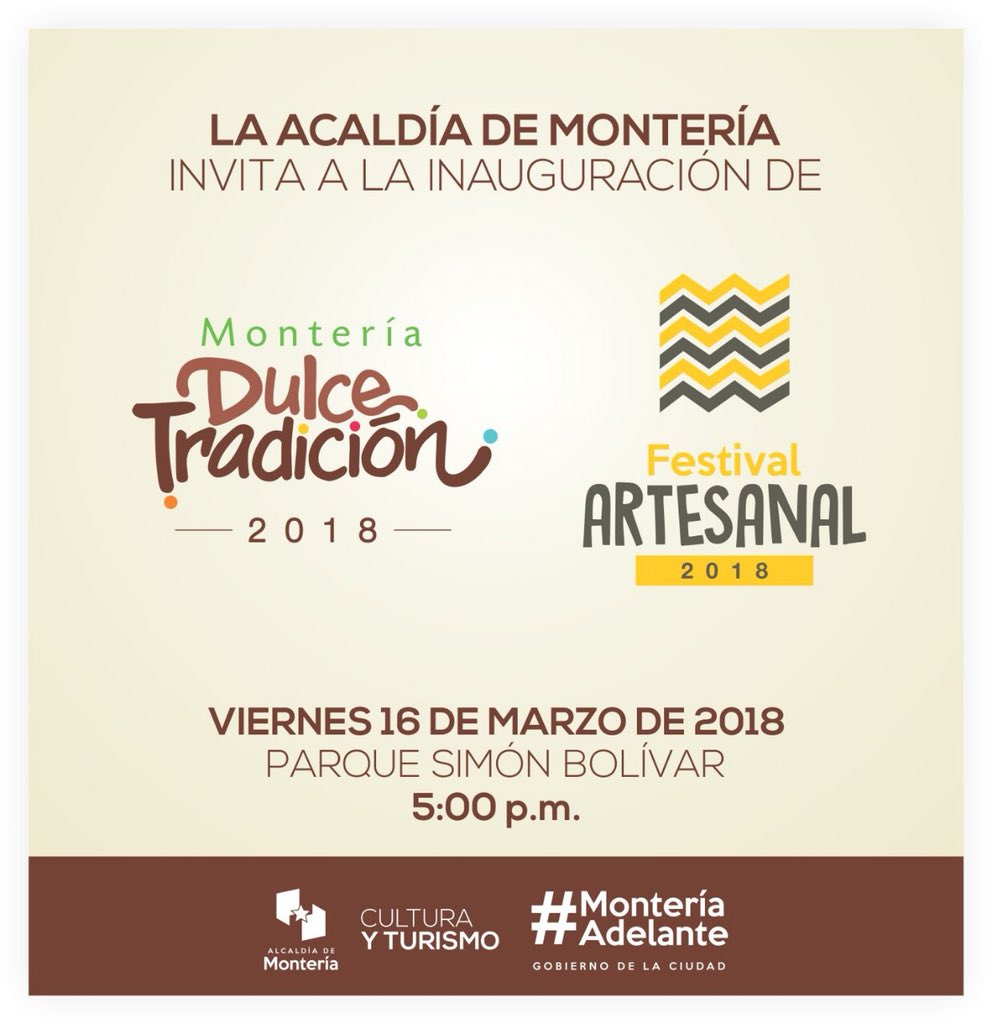 A partir de las 5:00 de la tarde de este viernes 16 de marzo, en el parque Simón Bolívar, centro de la ciudad de Montería se llevará a cabo la inauguración del Festival Montería Dulce Tradición y el Festival Artesanal 2018, que congrega a grandes artistas y maestras culinarias, para el deleite de propios y visitantes, con miras a la Semana Mayor.