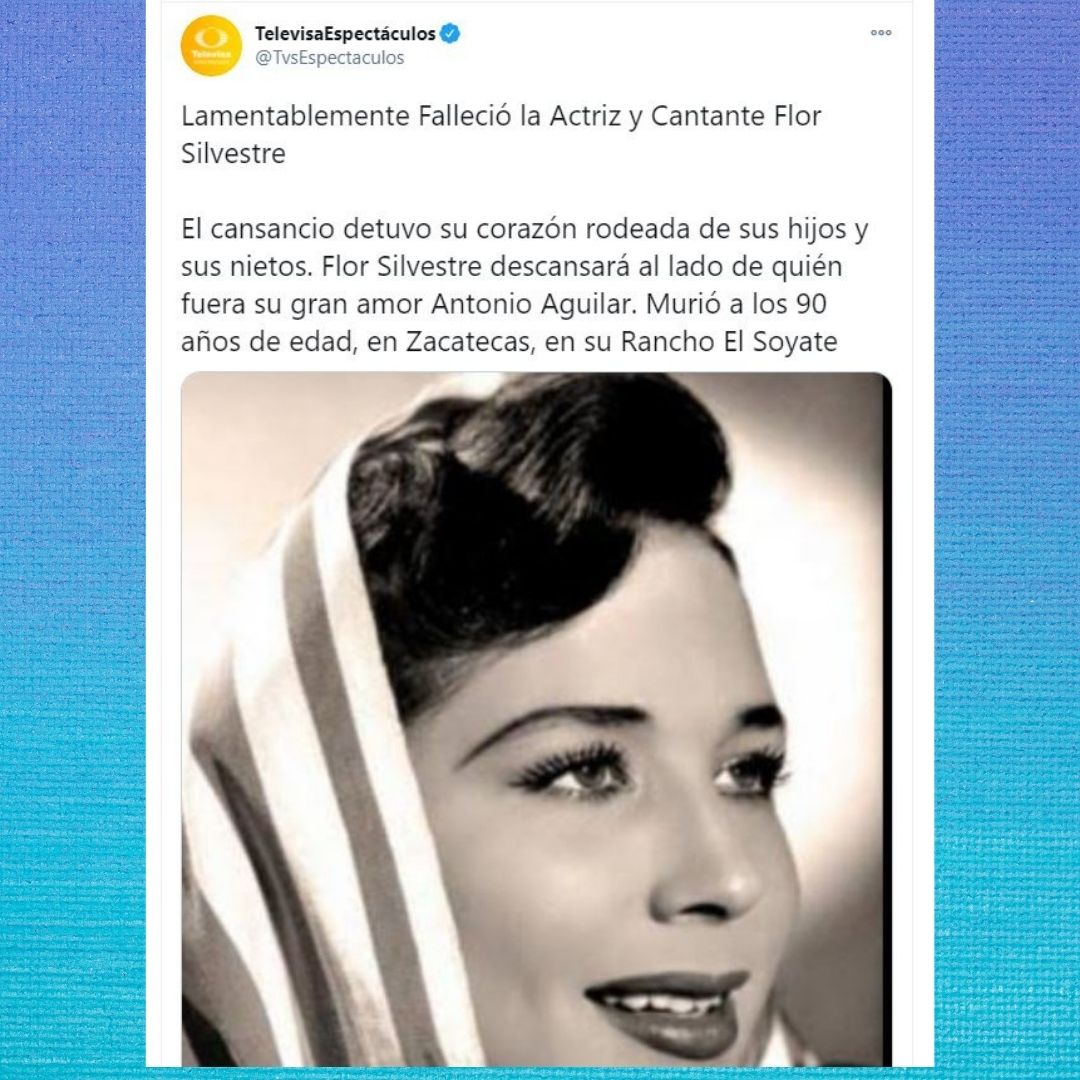 #Noticias| Este miércoles se dio a conocer el fallecimiento de la actriz y cantante mexicana Flor Silvestre, a los 90 años de edad por causas naturales. La noticia fue revelada por la cadena Televisa. ‘El cansancio detuvo su corazón rodeada de sus hijos y sus nietos’. Su deceso ocurrió en Zacatecas.