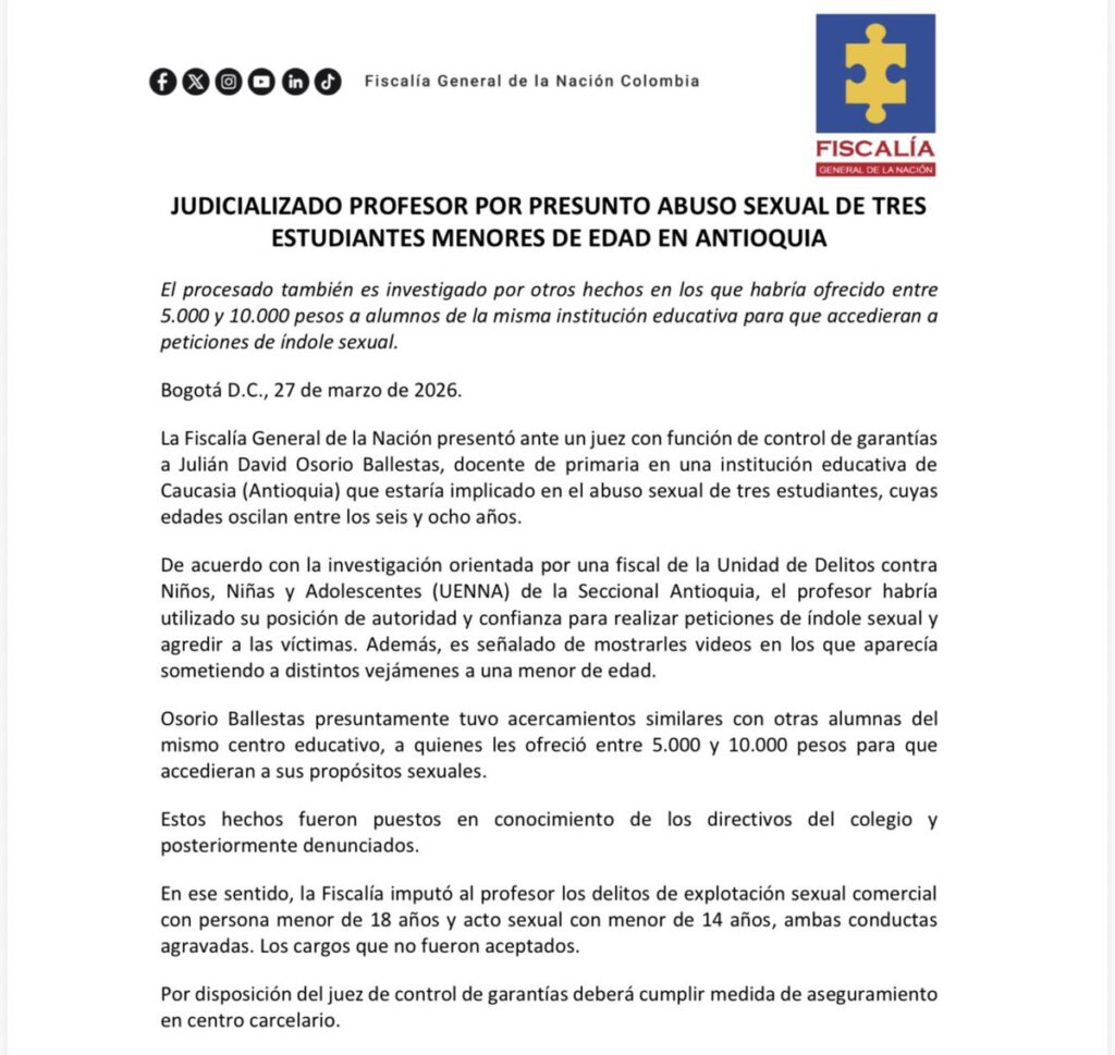 La Fiscalía General de la Nación logró la judicialización de Julián David Osorio Ballestas, docente de primaria en una institución educativa de Caucasia, Antioquia, señalado de abusar sexualmente de tres de sus estudiantes, todas niñas con edades entre los seis y ocho años. Un juez de control de garantías ordenó su traslado a un centro carcelario donde permanecerá mientras avanza el proceso judicial.