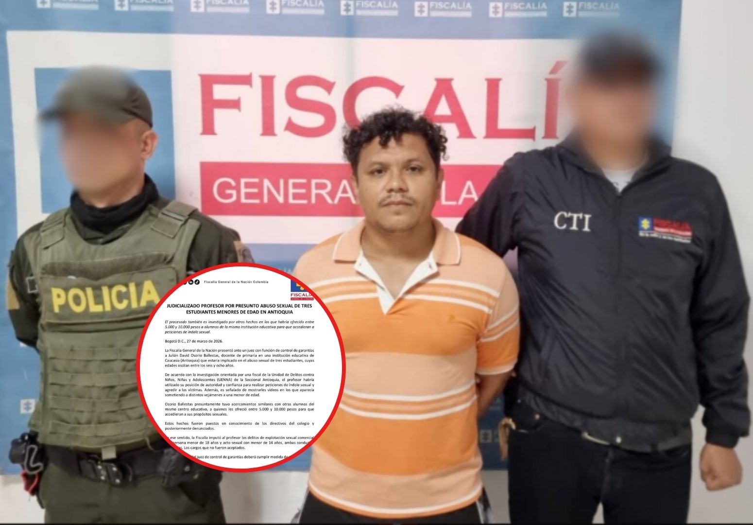 La Fiscalía General de la Nación logró la judicialización de Julián David Osorio Ballestas, docente de primaria en una institución educativa de Caucasia, Antioquia, señalado de abusar sexualmente de tres de sus estudiantes, todas niñas con edades entre los seis y ocho años. Un juez de control de garantías ordenó su traslado a un centro carcelario donde permanecerá mientras avanza el proceso judicial.