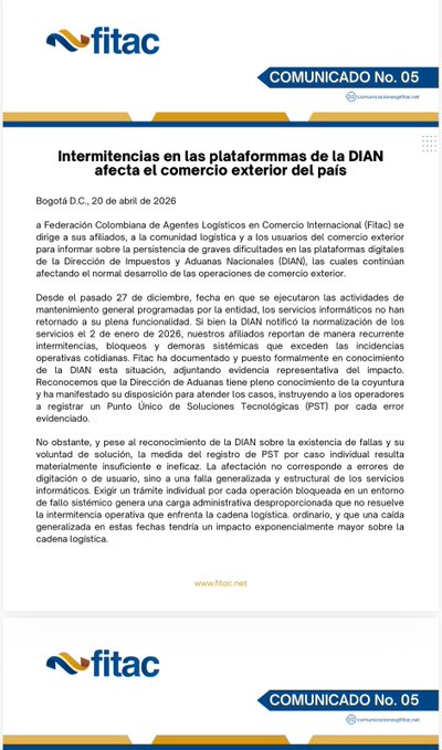 La Federación Colombiana de Agentes Logísticos en Comercio Internacional, Fitac, emitió este lunes el Comunicado No. 05 para denunciar que las fallas en las plataformas digitales de la Dirección de Impuestos y Aduanas Nacionales, DIAN, persisten desde el 27 de diciembre de 2025 y siguen afectando de manera grave el normal desarrollo de las operaciones de comercio exterior en el país.