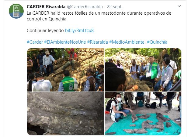 La Corporación Autónoma Regional de Risaralda, conocieron del hallazgo cuando se encontraban realizando un procedimiento de vigilancia en una excavación minera en ese departamento. El mastodonte estaba a 20 metros de profundidad.