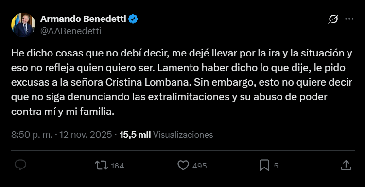 Sin embargo, Benedetti aclaró que mantiene su posición sobre el proceso judicial. “Esto no quiere decir que no siga denunciando las extralimitaciones y su abuso de poder contra mí y mi familia”, señaló el ministro tras presentar sus disculpas a Lombana.