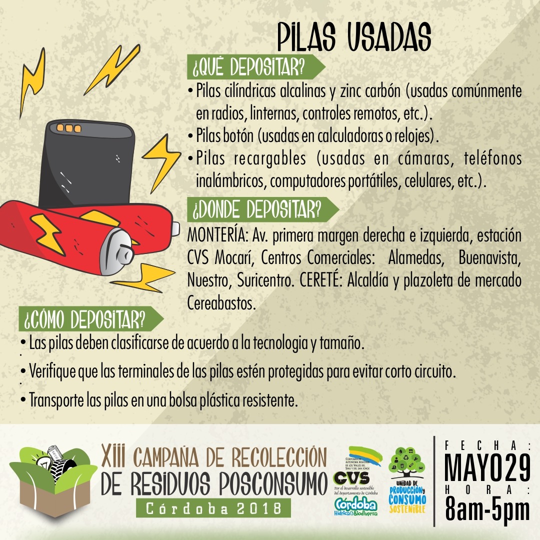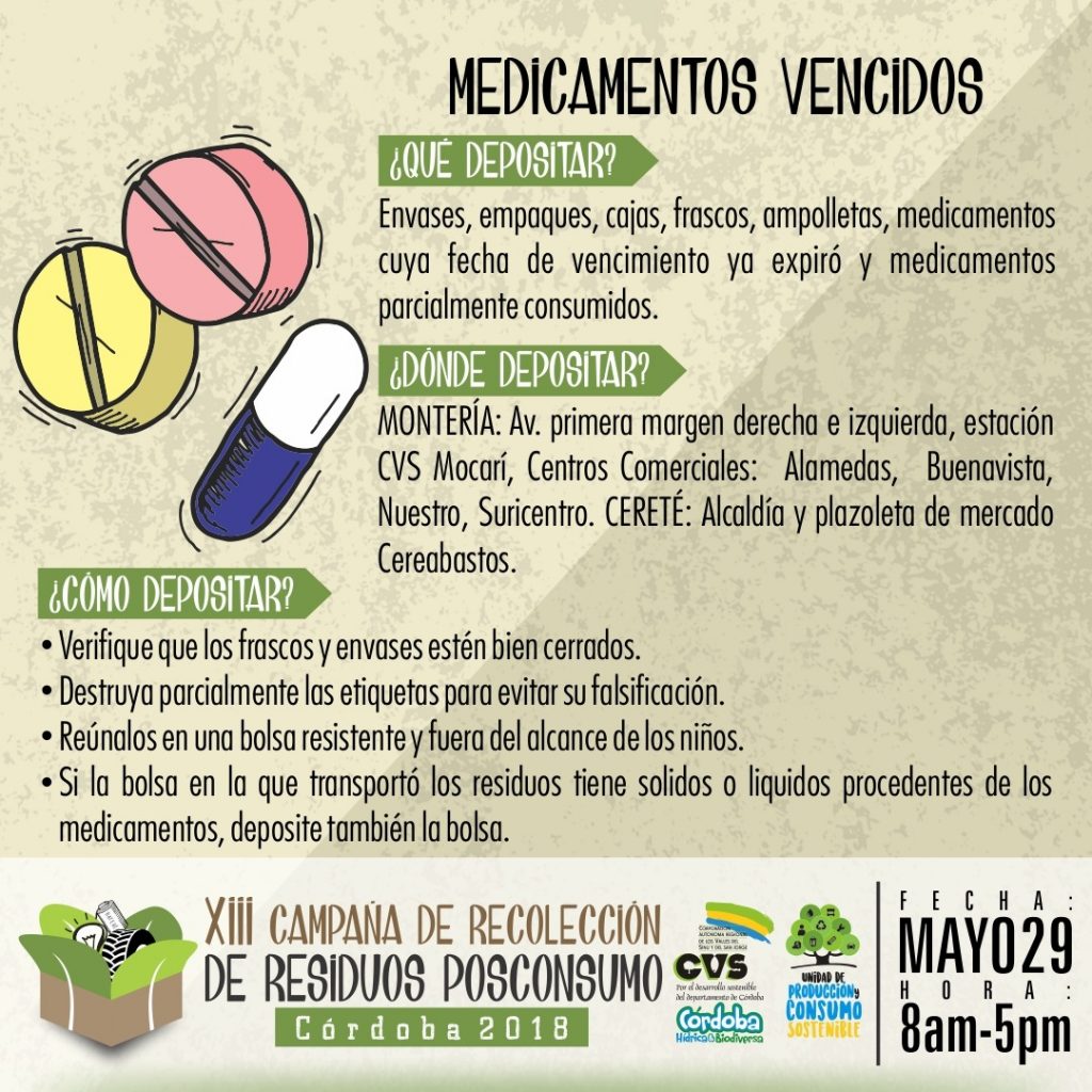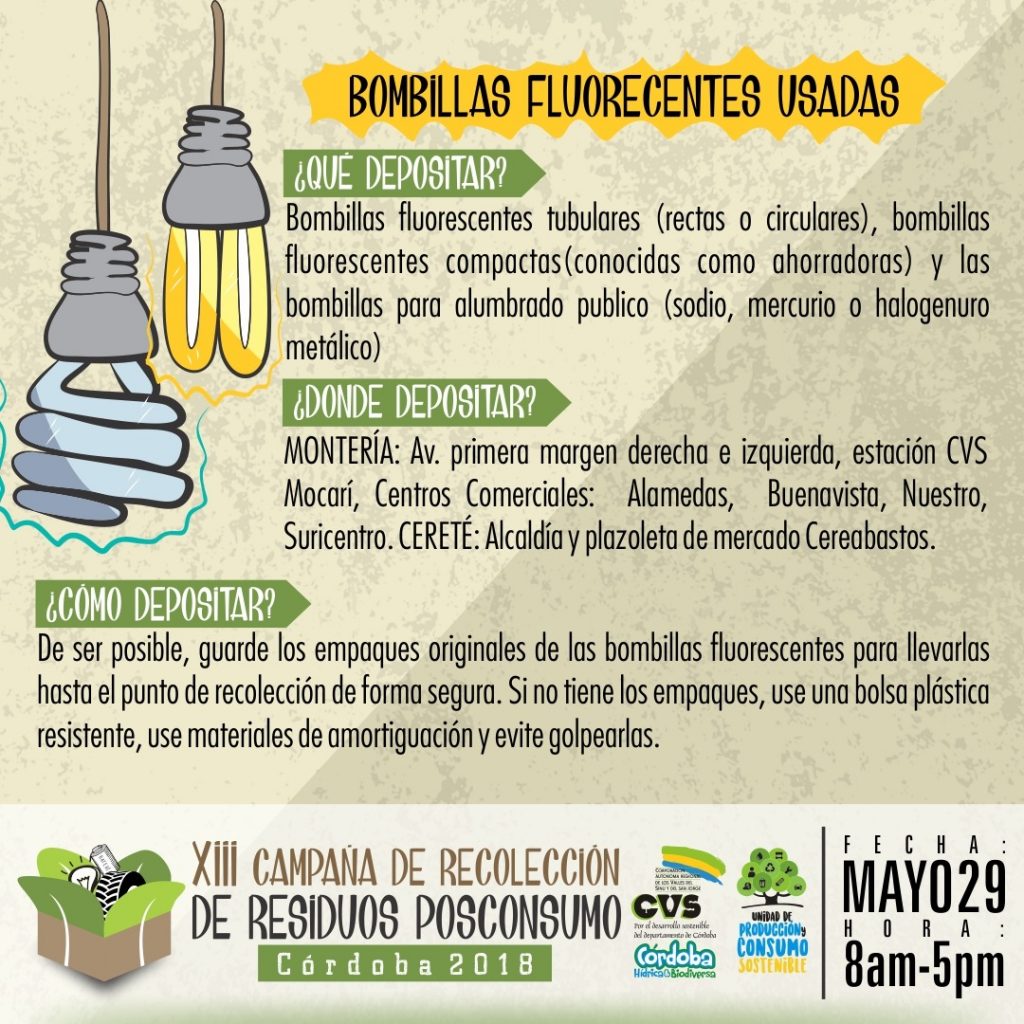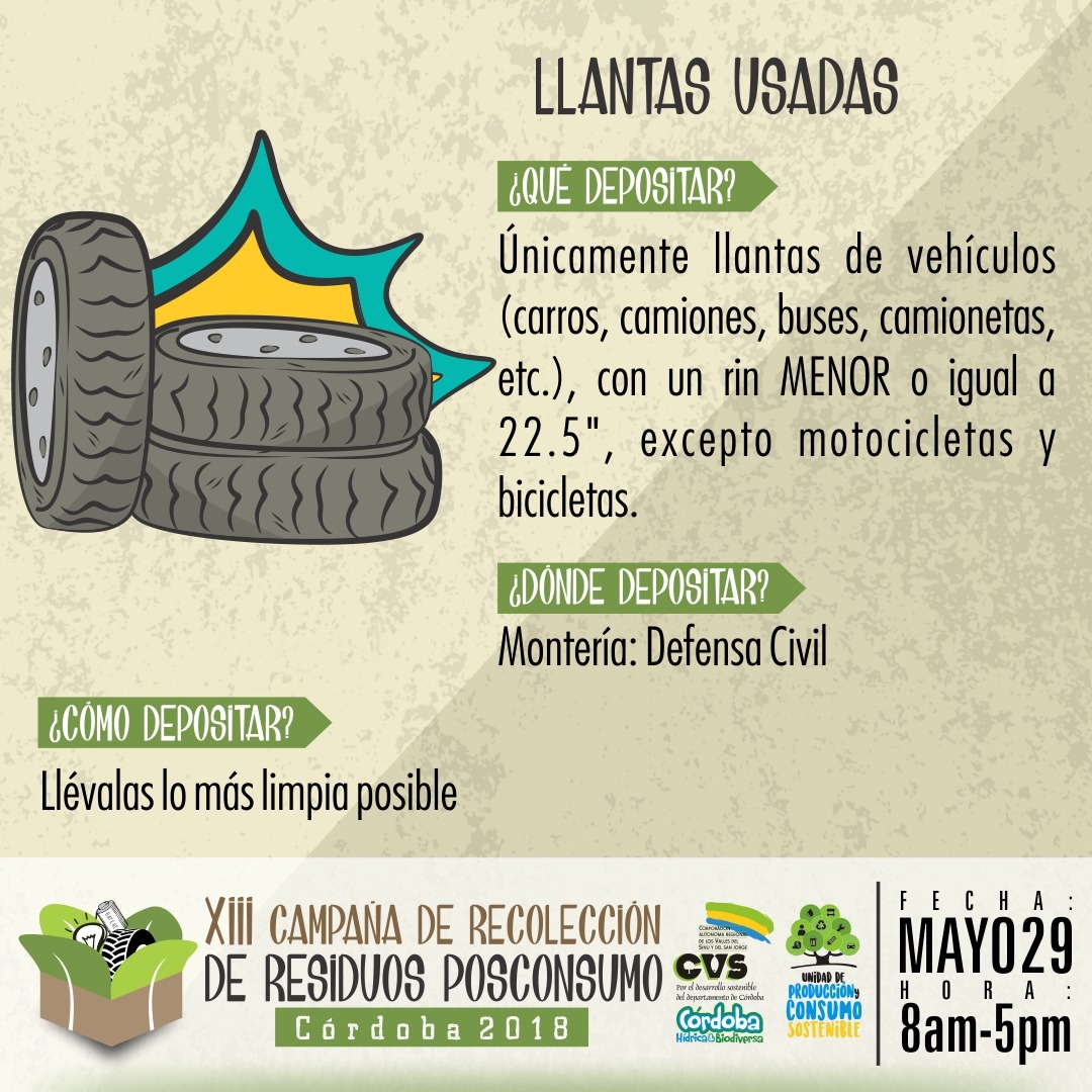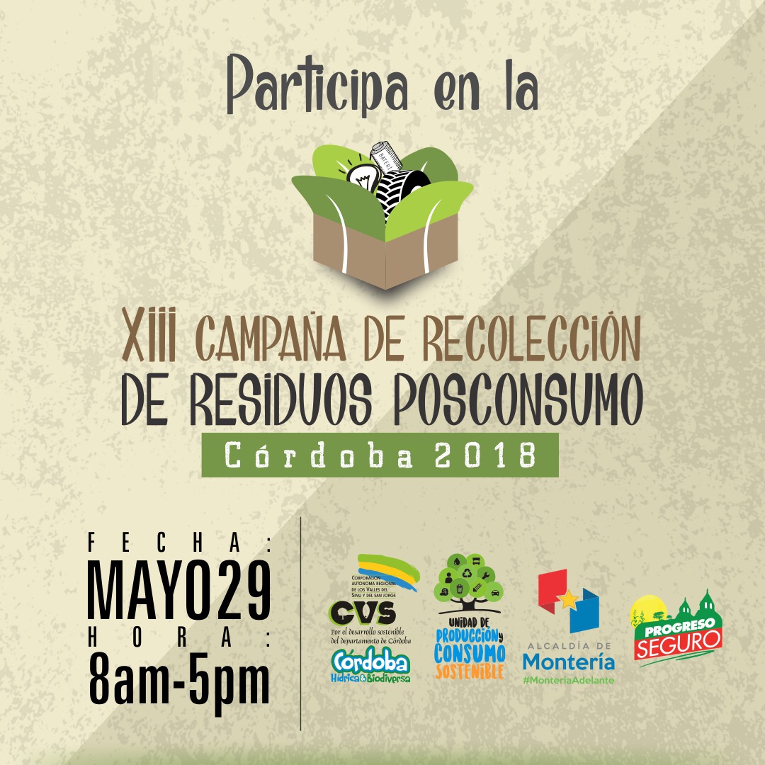 Hoy martes 29 de mayo, se realiza en Montería la XIII Jornada de Recolección de Residuos Posconsumo y la VI Llantatón, por lo cual desde la alcaldía municipal y las entidades organizadoras reiteraron la invitación a todos los ciudadanos para que se acerquen a los puntos de recolección dispuestos en donde podrán llevar bombillas fluorescentes, baterías, envases de plaguicidas domésticos, impresoras y electrodomésticos en desuso, medicamentos vencidos y llantas usadas.