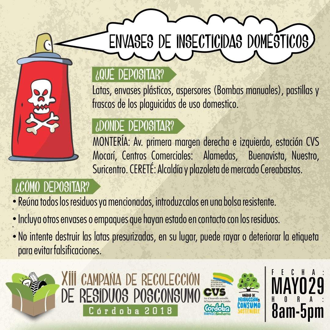 Se indicó que habrá puntos de depósito en la zona urbana de Montería, y así mismo, en la zona urbana se realizará un Plan Piloto de Recolección y Disposición final de envases de agroquímicos entre desde el 29 de mayo hasta el 1 de junio, en diferentes corregimientos.