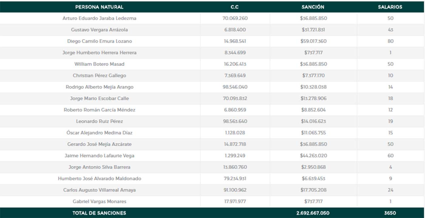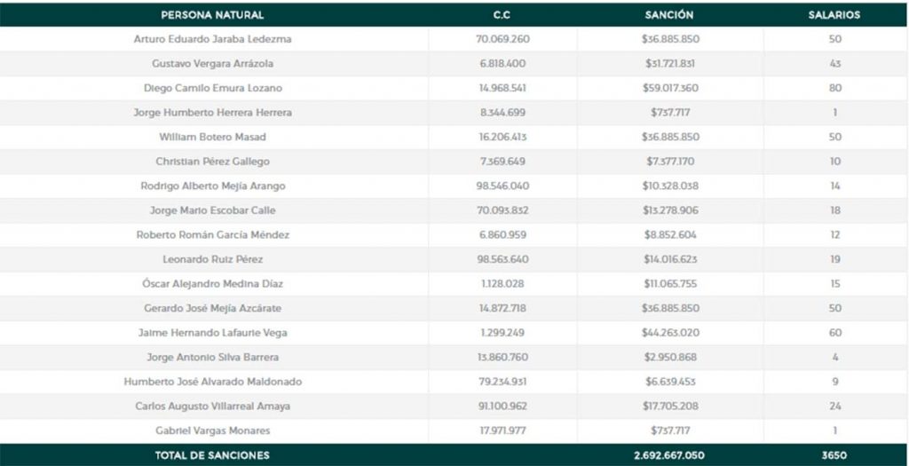 Además Reyes Villamizar sancionó a los 17 representantes legales de las asociaciones agremiadas, los cuales “colaboraron, facilitaron, autorizaron, ejecutaron o toleraron el diseño de este esquema, en violación de la Constitución y de la ley”.