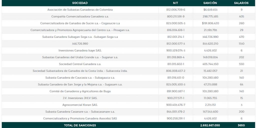 Entre las asociaciones sancionadas, se encuentran Subasta Ganadera Subagan Soga s.a, la cual se ubica en el municipio de Planeta Rica, con una multa de más de $346 millones de pesos, y la Subasta Ganadera de Caucasia s.a, con más de $100 millones de pesos.