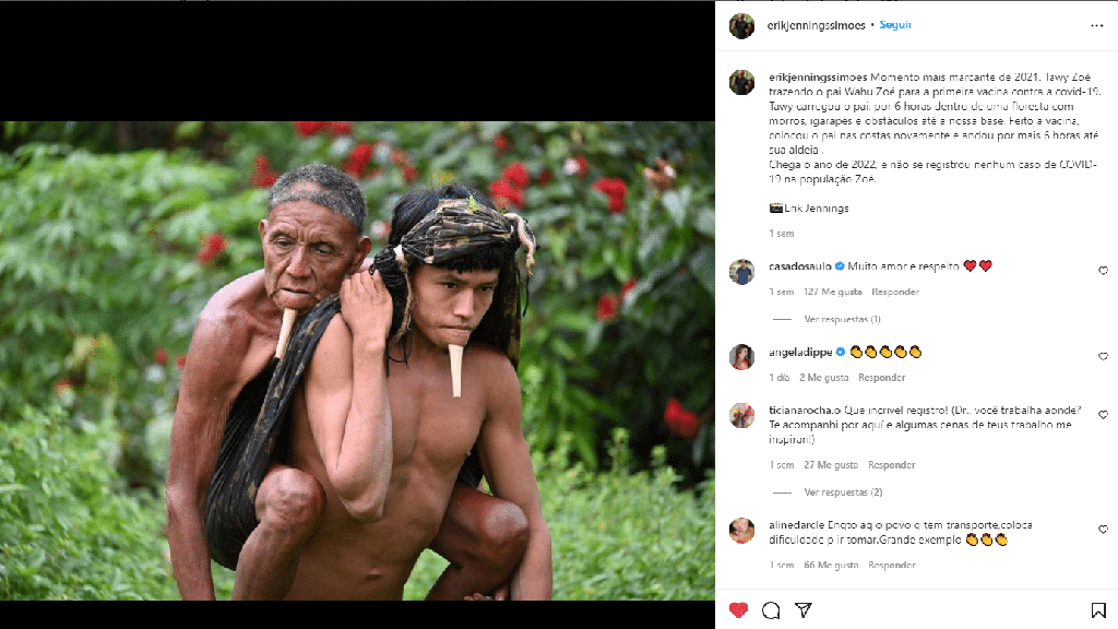 ‘El momento más llamativo de 2021. Tawy Zoé trayendo a su padre Wahu Zoé a la primera vacuna contra el covid-19. Tawy cargó a su padre durante seis horas en un bosque con cerros y obstáculos hasta nuestra base. Hecho la vacuna, volvió a poner a su padre en la espalda y caminó por seis horas más hasta su pueblo. Llega el año 2022, y no se ha registrado ningún caso de covid-19 en la población de Zoé’.