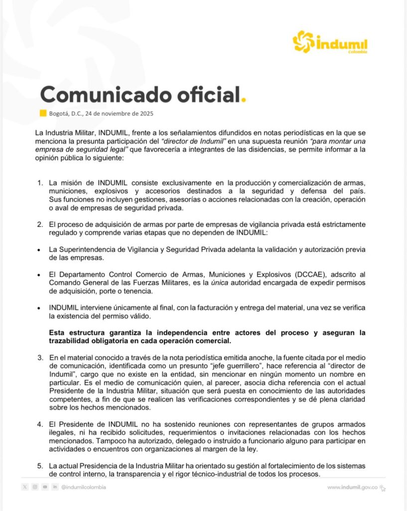 A través de un comunicado oficial fechado este 24 de noviembre de 2025, la entidad fue enfática al señalar que “el Presidente de Indumil no ha sostenido reuniones con representantes de grupos armados ilegales, ni ha recibido solicitudes, requerimientos o invitaciones relacionados con los hechos mencionados”.