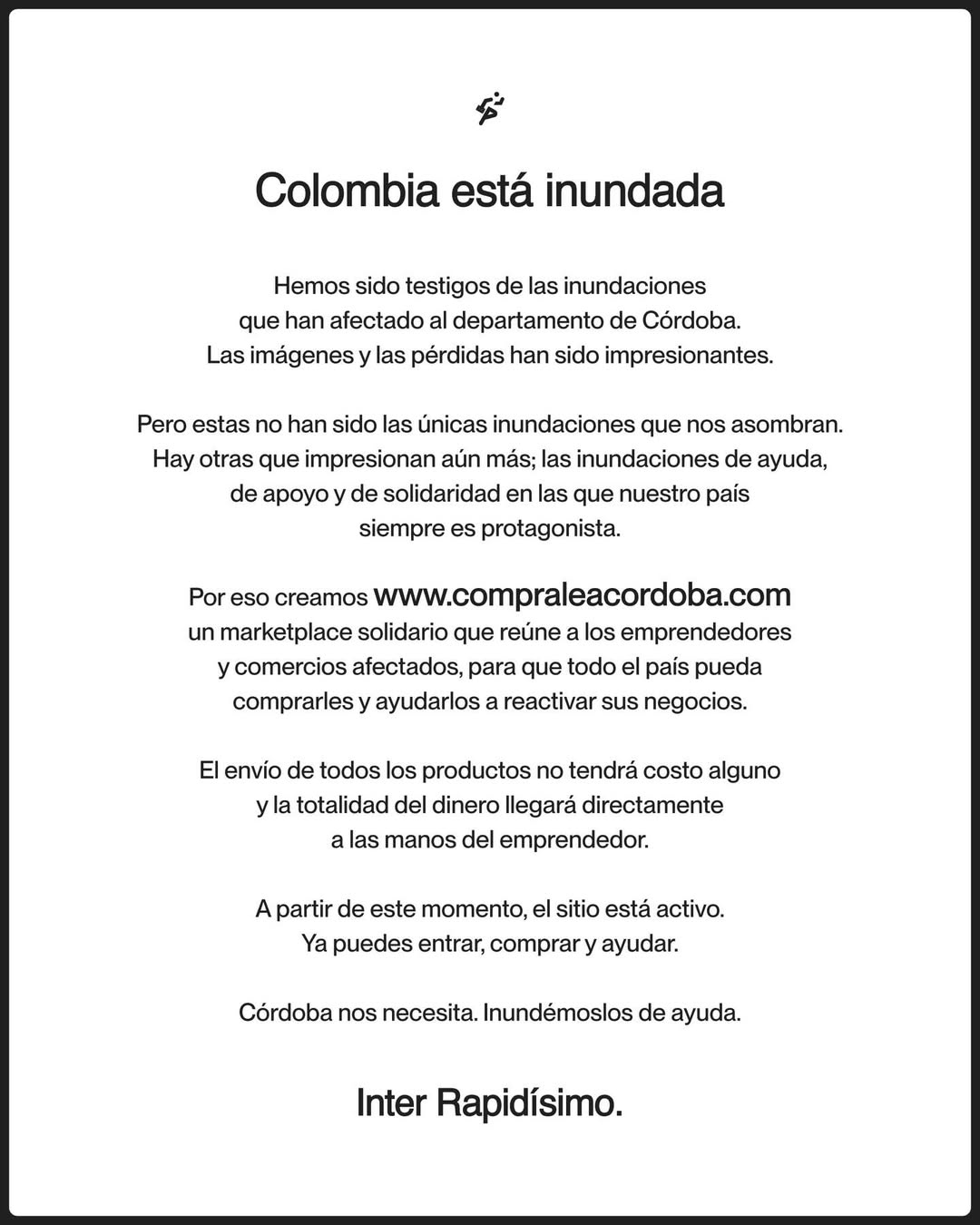 La empresa de logística y mensajería Inter Rapidísimo anunció la activación de www.compraleacordoba.com, un marketplace solidario diseñado para conectar a los emprendedores y comerciantes del departamento de Córdoba , golpeados por la actual emergencia invernal, con compradores de todo el país.
