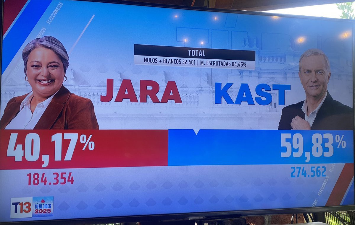 Kast obtiene el 59,83% de los votos válidos sobre el 40,17% de Jara, según informó el Servicio Electoral (Servel) en sus reportes preliminares.