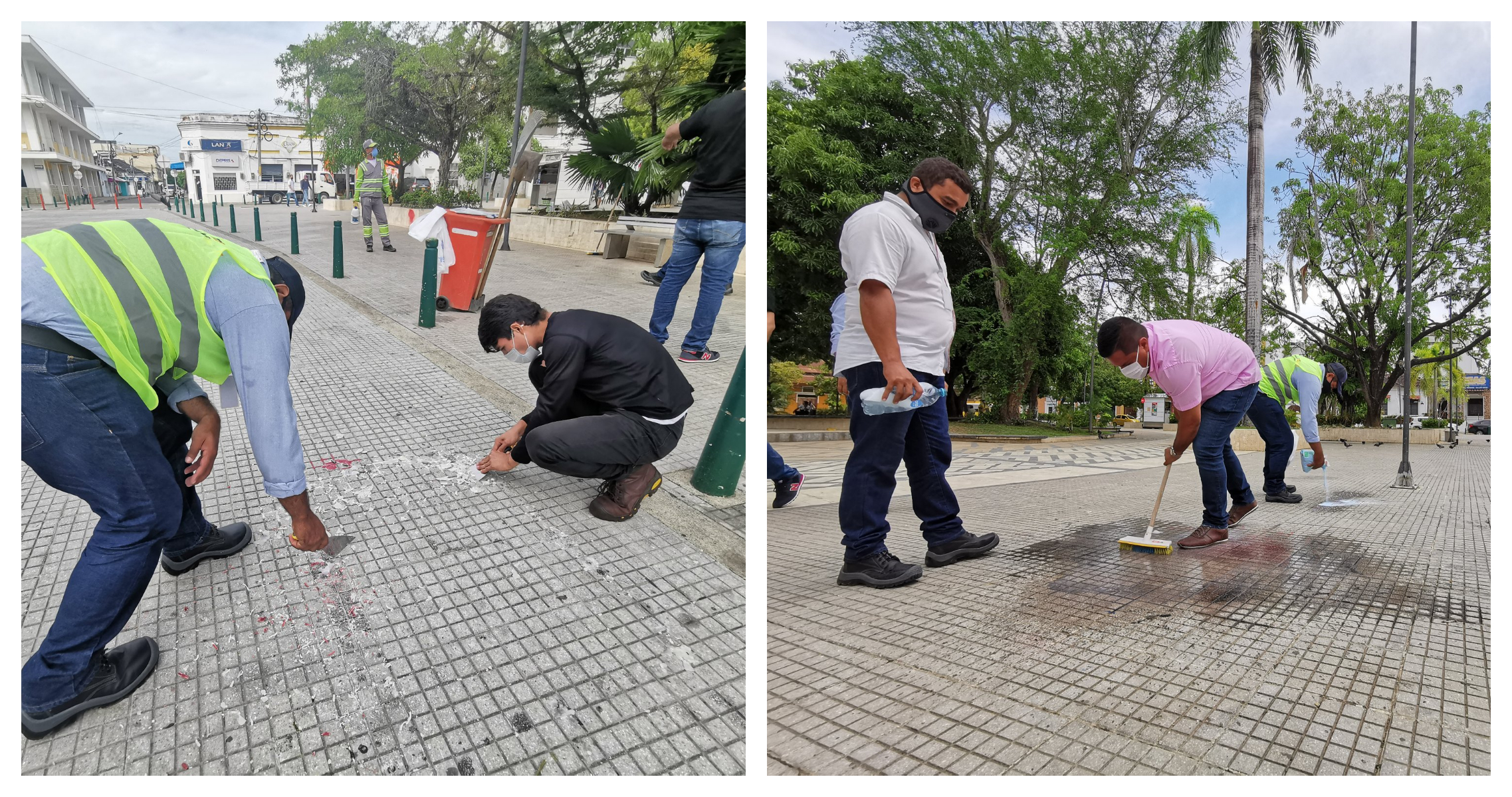 A esta hora los jóvenes limpian los monumentos y el piso del parque central de la ciudad en compañía de las autoridades de gobierno.