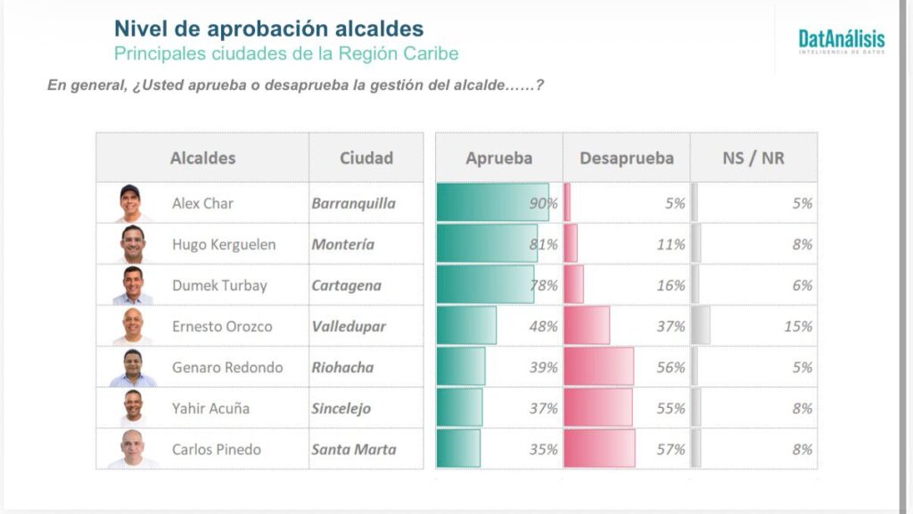 Por debajo del mandatario monteriano aparecen Dumek Turbay en Cartagena (78%), Ernesto Orozco en Valledupar (48%), Genaro Redondo en Riohacha (39%), Yahir Acuña en Sincelejo (37%) y Carlos Pinedo Cuello en Santa Marta (35%). La medición también registra que el 11% de los consultados desaprueba la gestión del alcalde, mientras el 8% no sabe o no responde.