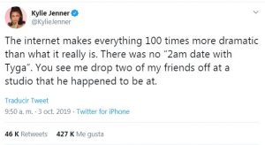 “Internet hace todo 100 veces más dramático de lo que realmente es. No hubo una “cita a las 2:00 a.m. con Tyga”. Ahí me ven dejando a dos de mis amigos en un estudio, en el que resultó estar él”, trinó Jenner.