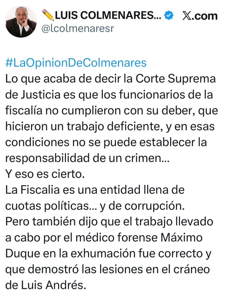 Colmenares respaldó la interpretación del fallo y fue más allá al cuestionar la estructura interna del ente acusador. “La Fiscalia es una entidad llena de cuotas política y de corrupción.”, expresó en el mismo mensaje.