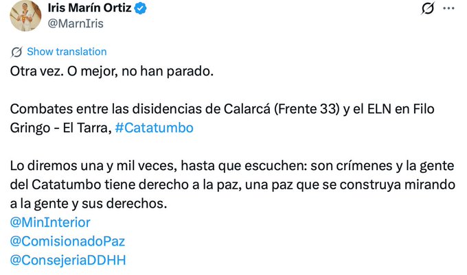 La defensora también dejó claro que los hechos no representan un capítulo nuevo ni aislado: la violencia en el Catatumbo, lejos de haberse detenido, ha continuado de forma sostenida. “Otra vez. O mejor, no han parado”, escribió, en una frase que resume la desesperación de las comunidades que siguen atrapadas entre los dos grupos armados.