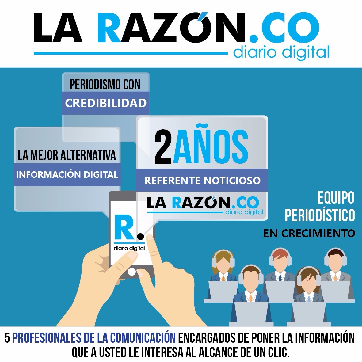 LA RAZÓN.CO, está en constante crecimiento, actualmente cinco profesionales de la comunicación se encargan de poner la información que a usted le interesa al alcance de un clic.