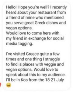 Esto escribió el influencer cuya identidad no se dio a conoce, empezó diciendo que había oído hablar del local gracias a un amigo. Posteriormente, les lanzó la propuesta: ‘soy un influencer, ¿puedo ir a comer a cambio de publicar una foto de tu restaurante en Instagram?’ Preguntó.