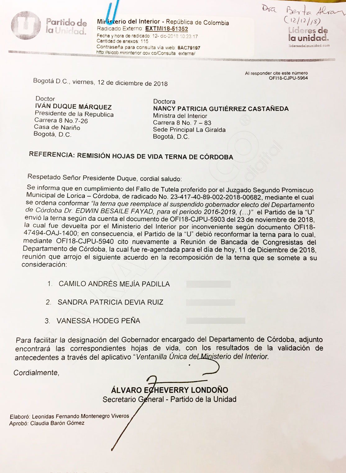 Montería. El Partido de La U remitió al Ministerio del Interior la nueva terna para elegir gobernador encargado de Córdoba, reemplazando el nombre de Orlando Medina Marsiglia, uno de los primeros ternados cuya hoja de vida fue rechazada por ‘inconveniente’.