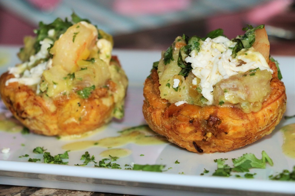 Segunda entrada: mariscos, plátanos y ahoga’o y queso (camarón, pulpo, corvina y almeja salteados en leche de coco, guiso criollo y cilantro servidos sobre una canasta de patacón).