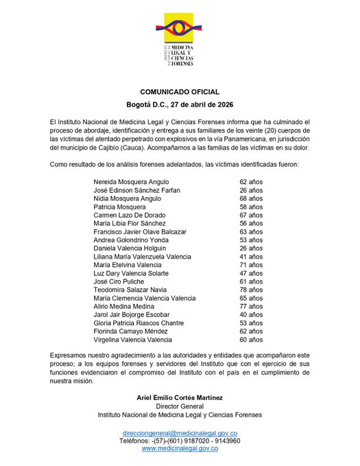 El Instituto Nacional de Medicina Legal y Ciencias Forenses informó este lunes que culminó el proceso de abordaje, identificación y entrega a sus familias de los 20 cuerpos de las víctimas del atentado con explosivos perpetrado en la vía Panamericana, en jurisdicción del municipio de Cajibío, Cauca.