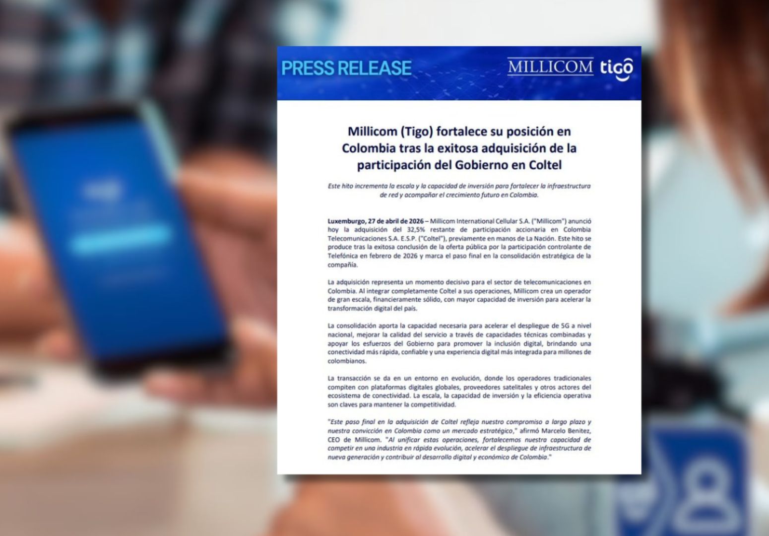 Marcelo Benítez, CEO de Millicom, destacó el alcance estratégico de la transacción: “Este paso final en la adquisición de Coltel refleja nuestro compromiso a largo plazo y nuestra convicción en Colombia como un mercado estratégico”. El directivo amplió el alcance del anuncio: “Al unificar estas operaciones, fortalecemos nuestra capacidad de competir en una industria en rápida evolución, acelerar el despliegue de infraestructura de nueva generación y contribuir al desarrollo digital y económico de Colombia”.