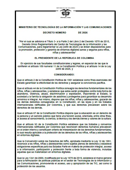 El Ministerio de Tecnologías de la Información y las Comunicaciones anunció la apertura de una consulta pública para un proyecto de decreto orientado a fortalecer la protección de niños, niñas y adolescentes en entornos digitales.