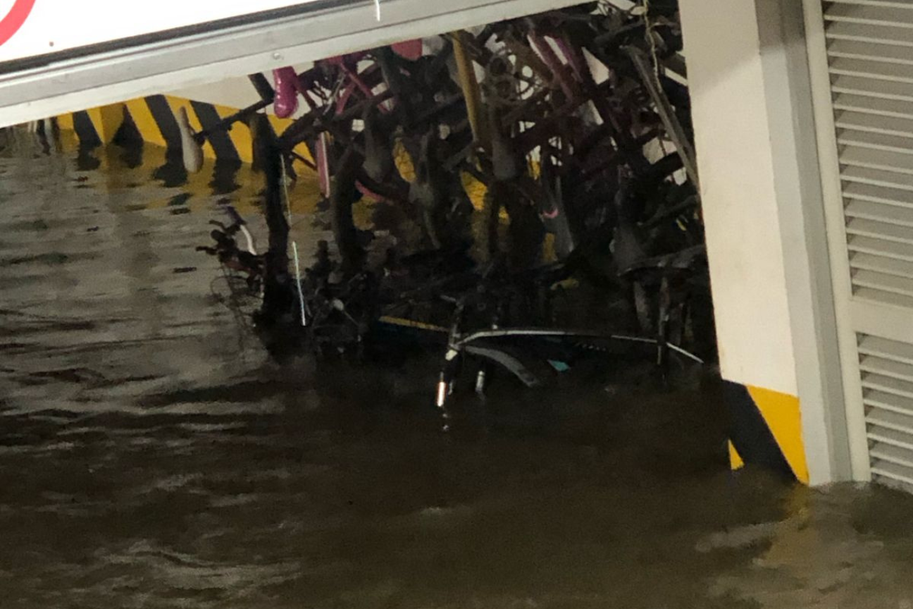 Al norte de la capital, el edificio Lugano en el barrio Monteverde y otras construcciones se encuentran inundados debido a la magnitud del aguacero que superó la capacidad de drenaje de la zona.