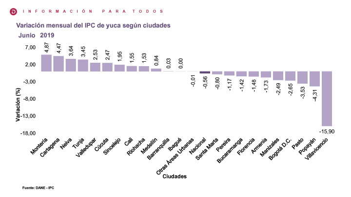 Algo similar ocurre con la yuca, según el IPC de este producto por ciudades, Montería tiene la mayor variación con un 4.87 y Cartagena con 4.47 puntos. La libra de yuca se cotiza en promedio a $1120 en almacenes de cadena y en centrales de abasto entre $800 y $900.