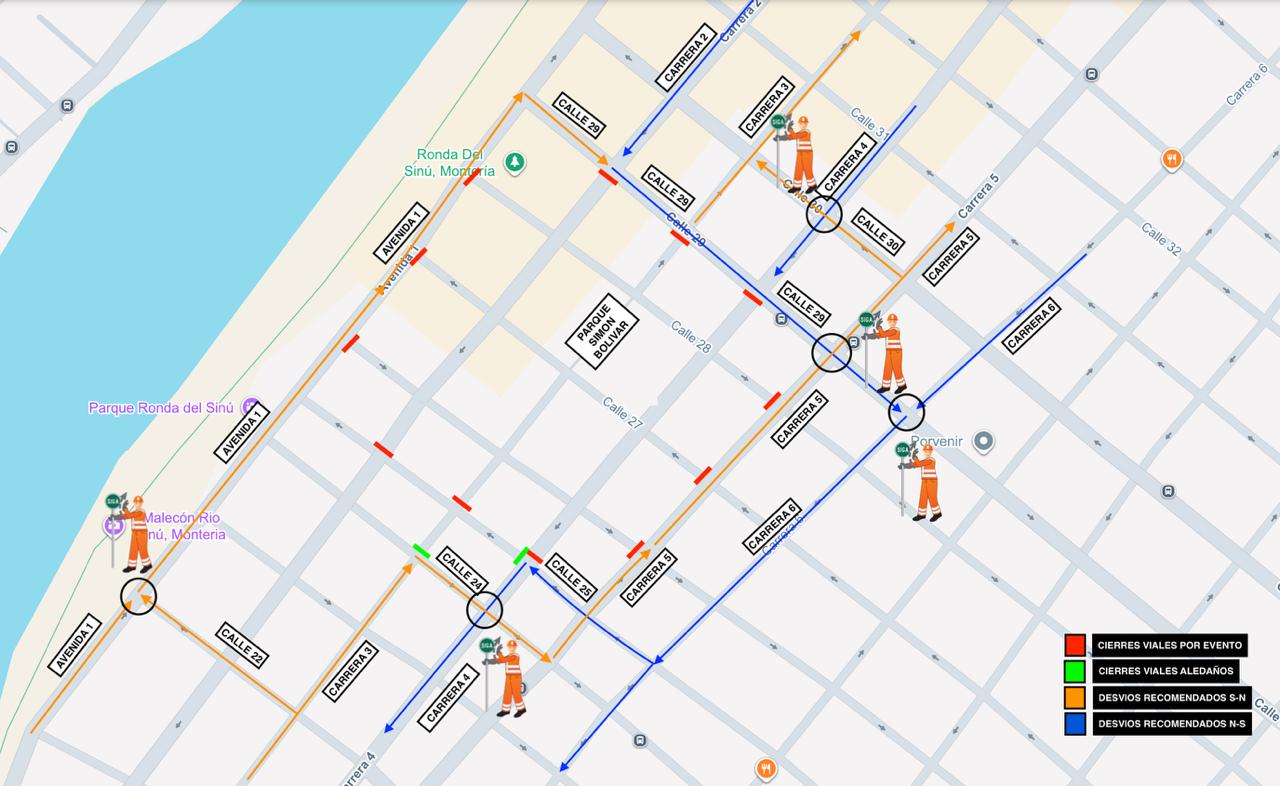 La Alcaldía de Montería implementará un plan especial de cierres viales y desvíos este domingo 9 de noviembre entre las 10:00 de la mañana y las 11:00 de la noche, con motivo de la ceremonia de clausura de los VII Juegos Deportivos Escolares Centroamericanos y del Caribe 2025.