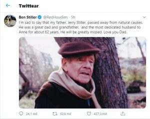 ‘Lamento informar que mi padre, Jerry Stiller, murió de causas naturales’ escribió en Twitter Ben. Y añadió ‘era un gran padre y abuelo, y fue el esposo más dedicado para Anne por unos 62 años. ‘Serás muy extrañado. Te amo papá’.