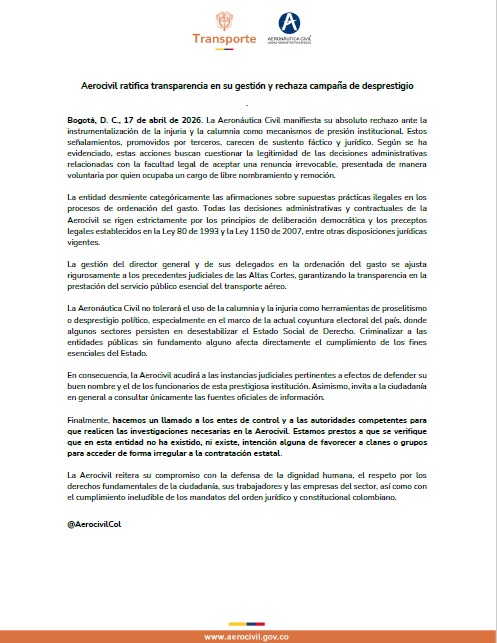 Aerocivil advirtió además que no se quedará sin respuesta frente a lo que considera una ofensiva deliberada contra su reputación institucional. La entidad anunció que adelantará acciones judiciales, sin precisar en su comunicado contra quiénes irán dirigidas ni en qué términos se formularán las denuncias.