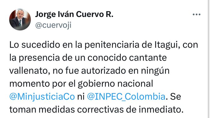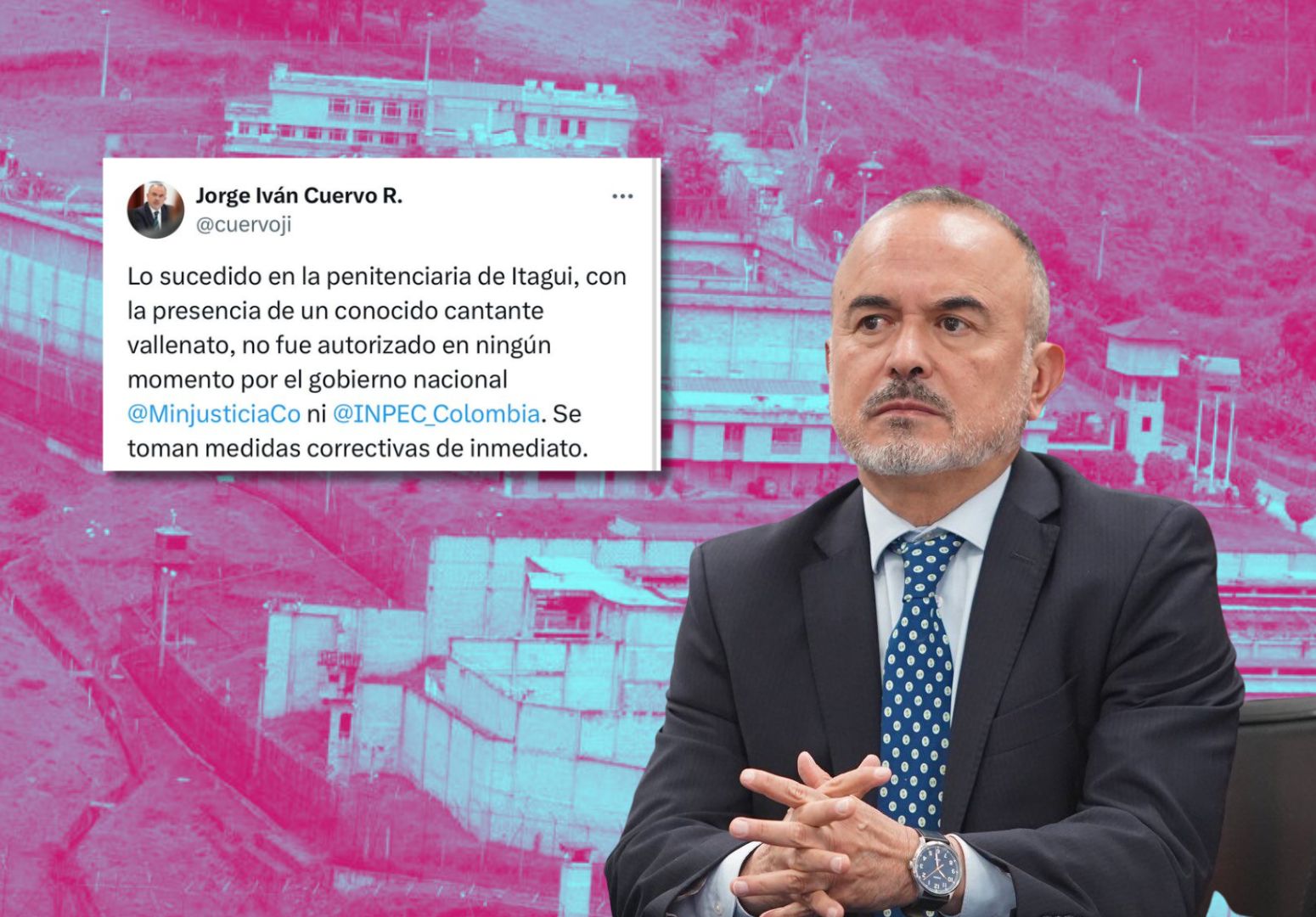El ministro de Justicia y del Derecho, Jorge Iván Cuervo Restrepo, rechazó este jueves el ingreso del cantante vallenato Nelson Velásquez a la penitenciaría de Itagüí y fue claro al señalar que la actividad no contó con ningún aval institucional. “Lo sucedido en la penitenciaría de Itagüí, con la presencia de un conocido cantante vallenato, no fue autorizado en ningún momento por el Gobierno Nacional ni el Inpec. Se toman medidas correctivas de inmediato”, escribió el funcionario en su cuenta de X.