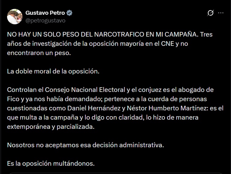 Petro calificó la decisión como un acto político disfrazado de control administrativo. Sostuvo que la oposición utiliza los organismos de control para intentar deslegitimar su Gobierno y afectar al progresismo. “Es la oposición multándonos”, afirmó, señalando que la resolución del CNE no será aceptada por su equipo jurídico y será objeto de impugnación.