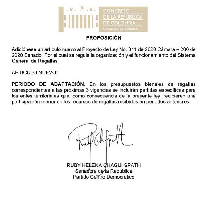 Redacción. La senadora del Centro Democrático, Ruby Chagüi, radicó una proposición al Proyecto de Ley que reforma el Sistema General de Regalías que busca que en los presupuestos bienales de las próximas tres vigencias se cree un período de adaptación y se envíe recursos para aliviar a municipios y departamentos cuyas finanzas se vean afectadas en el corto plazo.