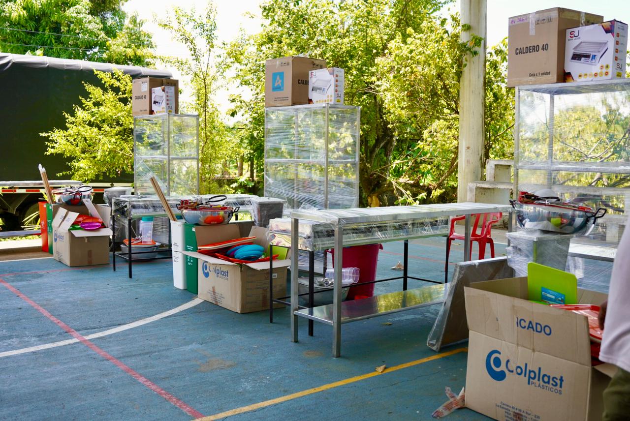 Cada uno de los nueve kits entregados incluye estufas industriales de cuatro fogones, neveras verticales de hasta 800 litros para garantizar la cadena de frío, licuadoras industriales, mobiliario en acero inoxidable, calderos de 50 litros, balanzas de precisión, platos, vasos y elementos de bioseguridad y limpieza biodegradable.