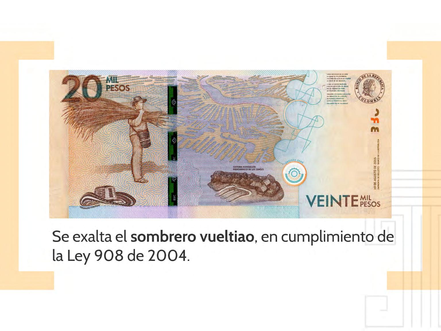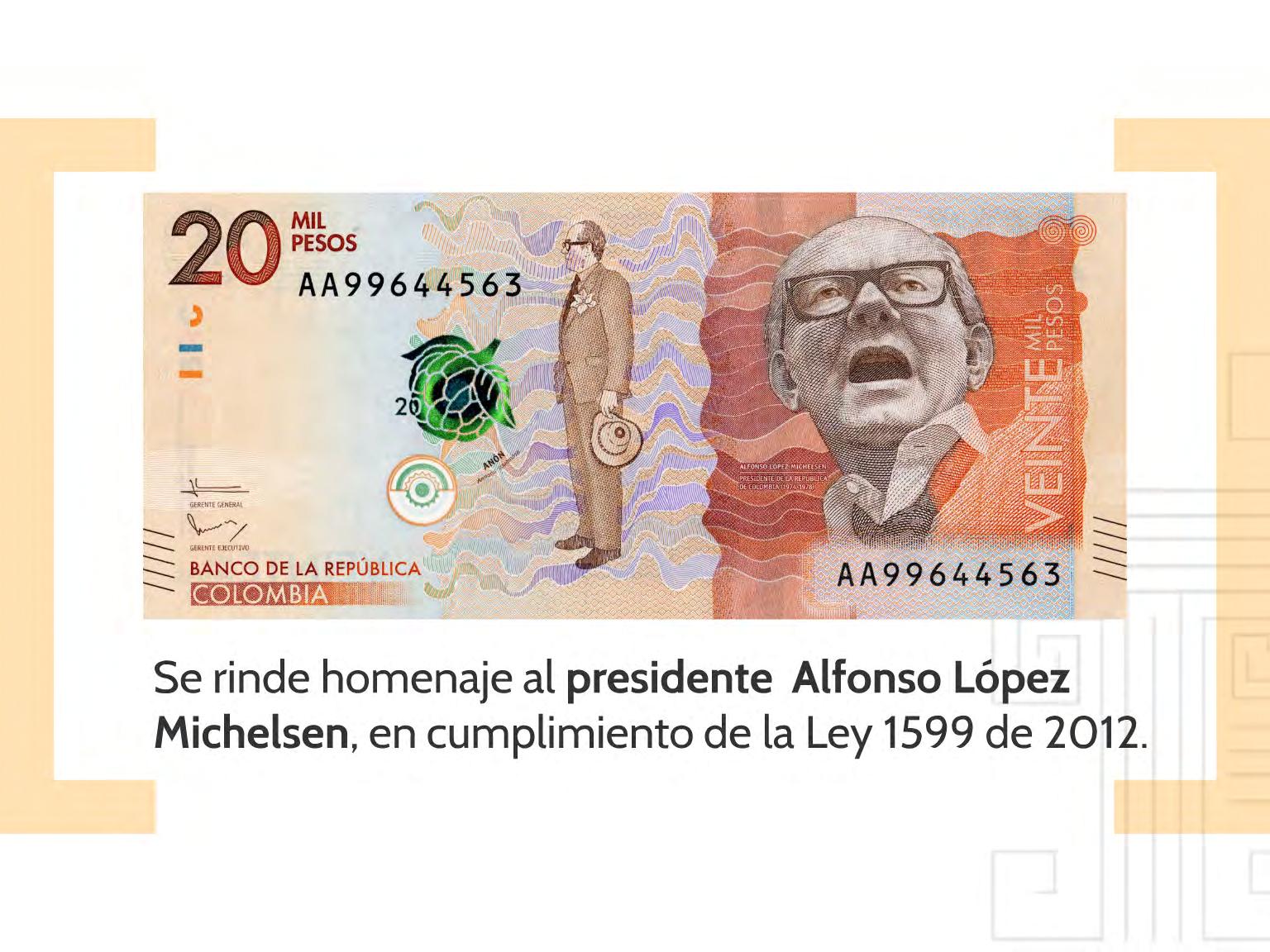 “Las principales figuras de este billete son una imagen del expresidente Alfonso López Michelsen, la de un campesino cargando caña flecha y un sombrero vueltiao, distintivo de las tierras de Córdoba y Sucre y finalmente el sistema hidráulico de canales de La Mojana creado por la cultura Zenú”, resaltó el gerente general del Banco de la República, José Darío Uribe, en el lanzamiento de la emisión del nuevo billete de 20 mil pesos, en Valledupar.