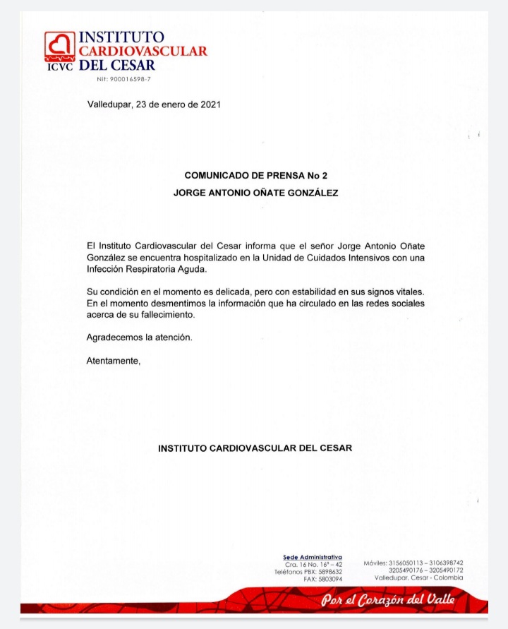 #Noticias| El Instituto Cardiovascular del Cesar emitió un nuevo comunicado sobre estado de salud del cantante de música vallenata, Jorge Oñate, hospitalizado desde el viernes por una infección respiratoria aguda en ese centro asistencial.