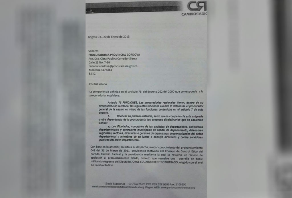 Cambio Radical, notificó a la Procuraduría de la sanción al diputado de Córdoba, Jorge Eduardo Benítez