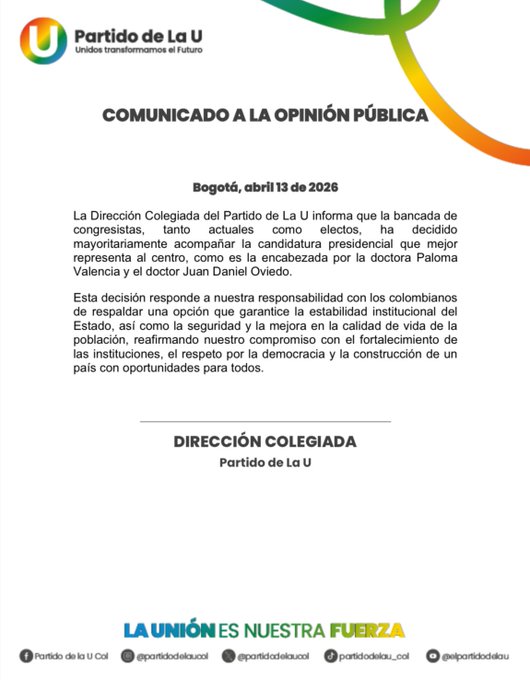 La Dirección Colegiada del Partido de La U informó este lunes que la bancada de congresistas, tanto actuales como electos, decidió mayoritariamente respaldar la candidatura presidencial de Paloma Valencia y Juan Daniel Oviedo, fórmula que el partido identifica como la opción que mejor representa al centro en la contienda electoral de cara a los comicios del 31 de mayo de 2026.