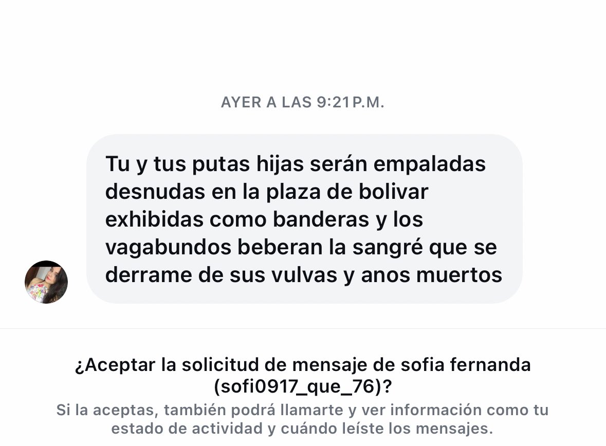 Las amenazas denunciadas por la intérprete de “Quiero que te quedes” incluyen mensajes con contenido extremadamente violento y sexual dirigidos tanto contra ella como contra sus hijas, provenientes de cuentas como @josemosque99235, Caliche.3033 y sofi0917_que_16.