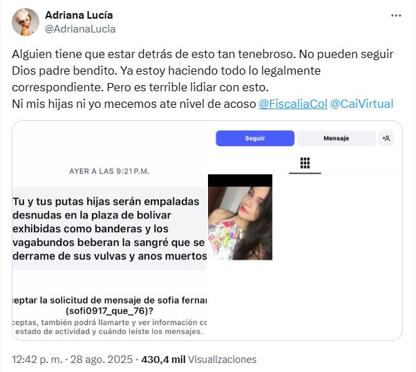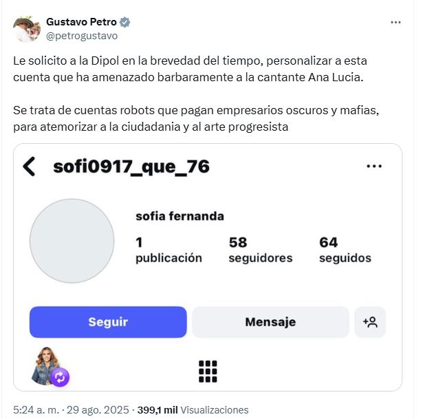 El presidente Gustavo Petro ordenó a la Dirección de Investigación Criminal e Interpol (Dipol) investigar urgentemente las cuentas responsables de las graves amenazas contra la cantante Adriana Lucía, denunciadas públicamente desde el pasado 25 de agosto.